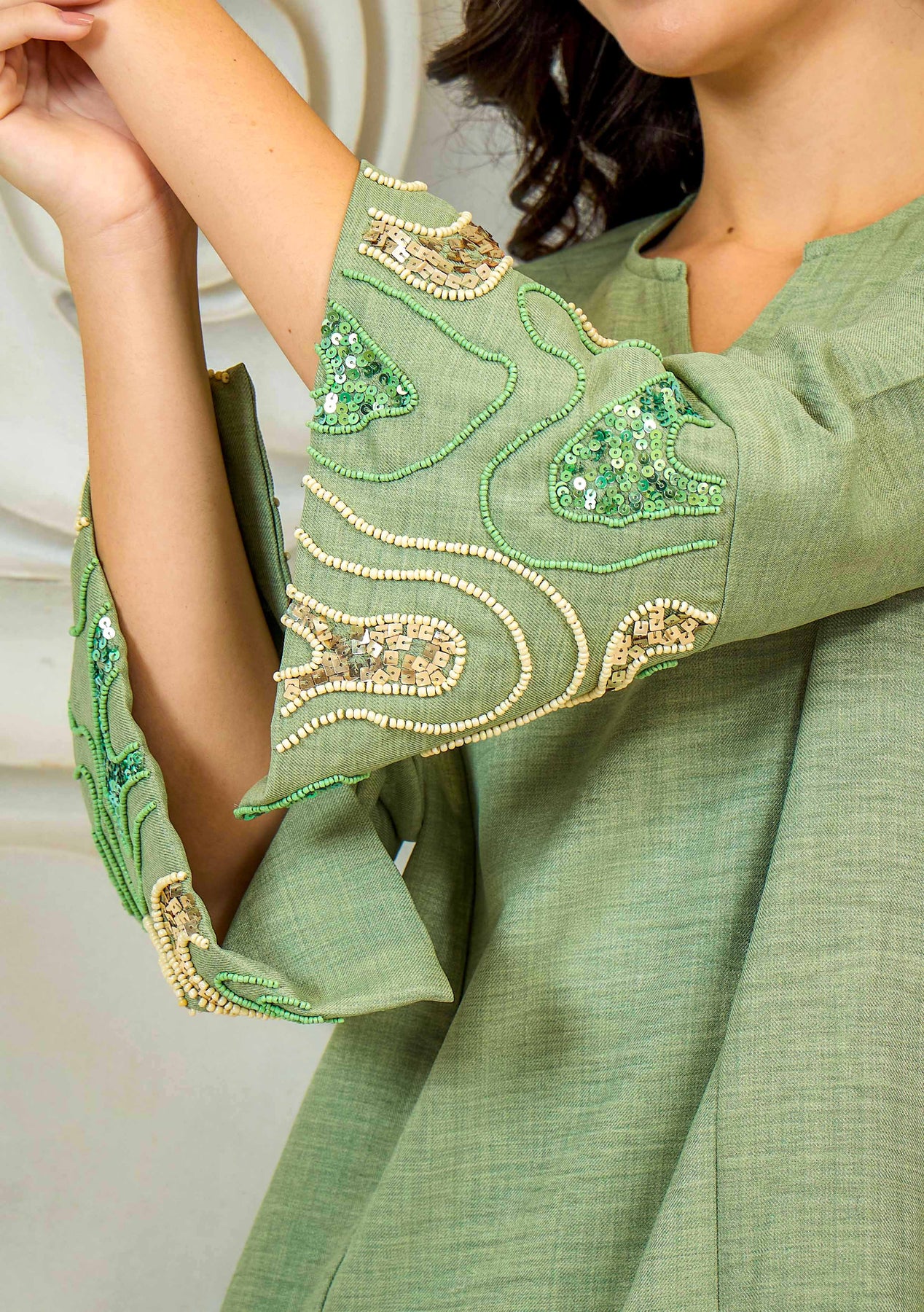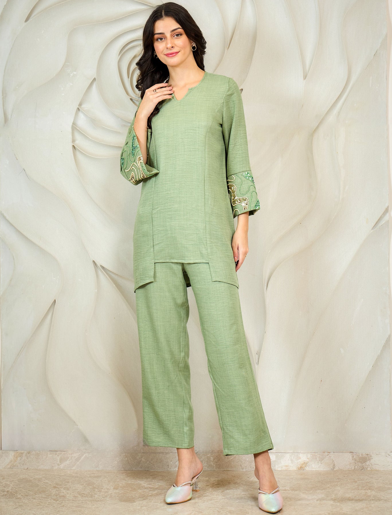 Athena Embroidered V-Neck Beads and Stones Linen Straight Kurta With Trousers