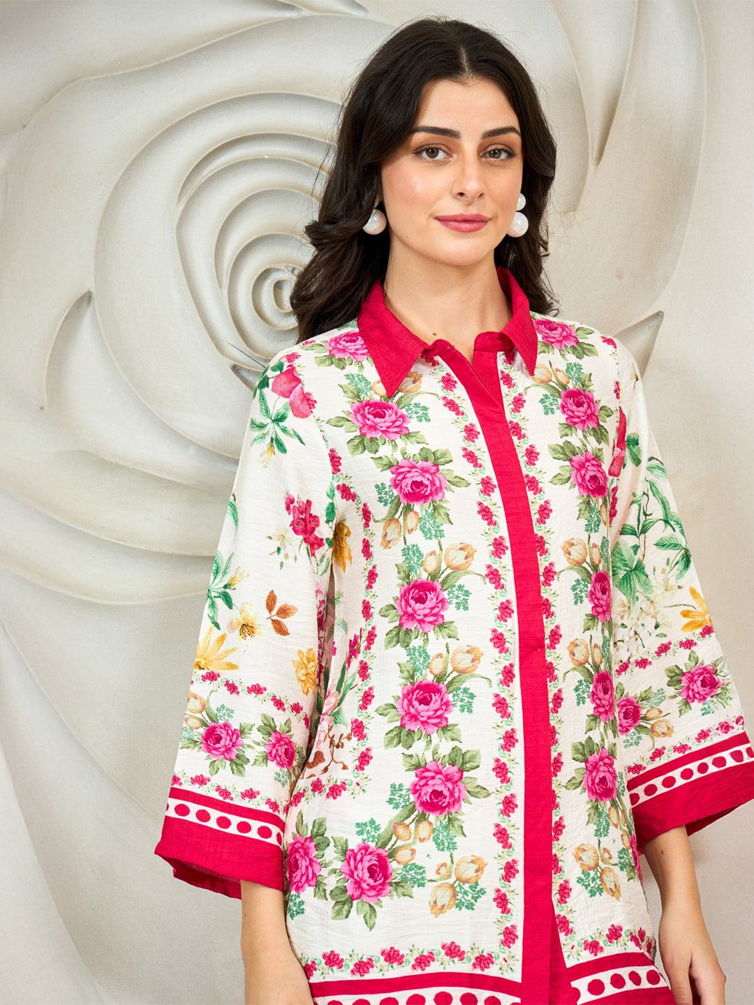 White and pink floral printed tunic , has a shirt collar neck and three quarter sleeves, secured with slip-on closure