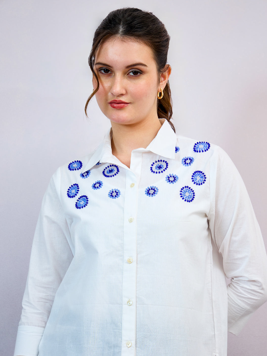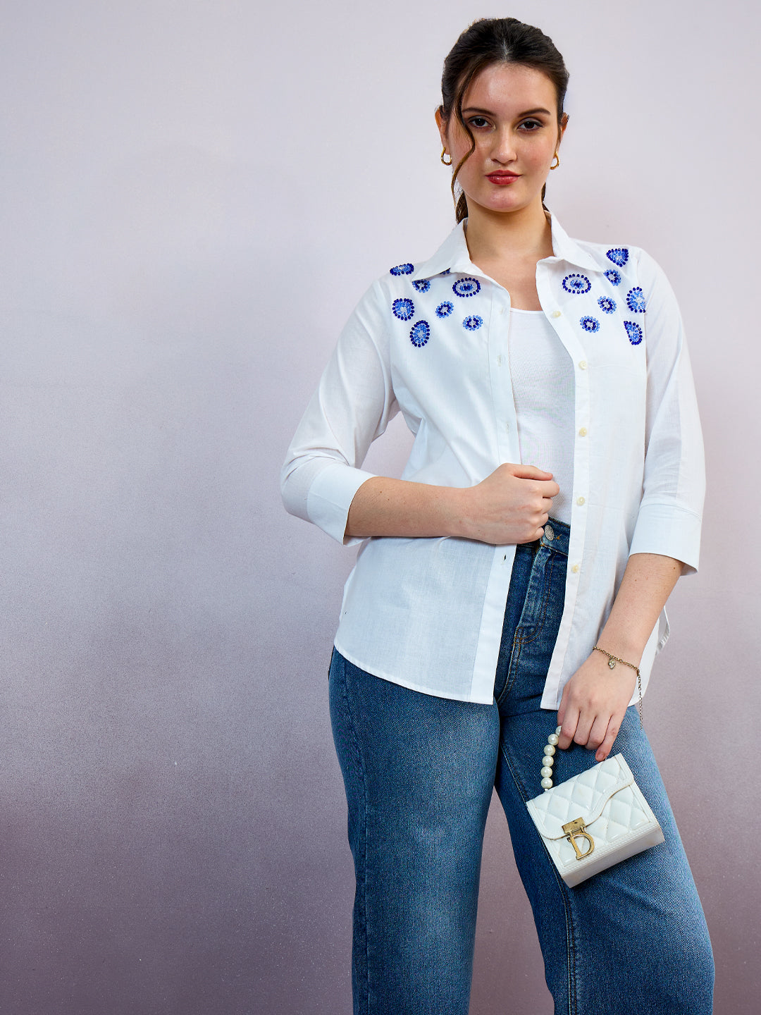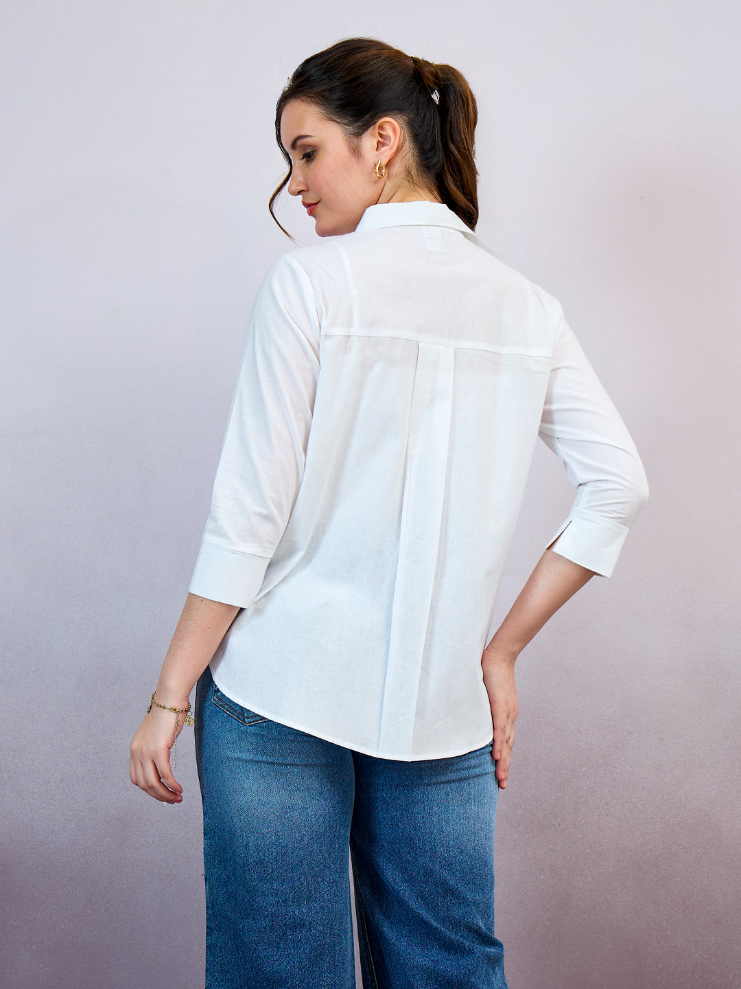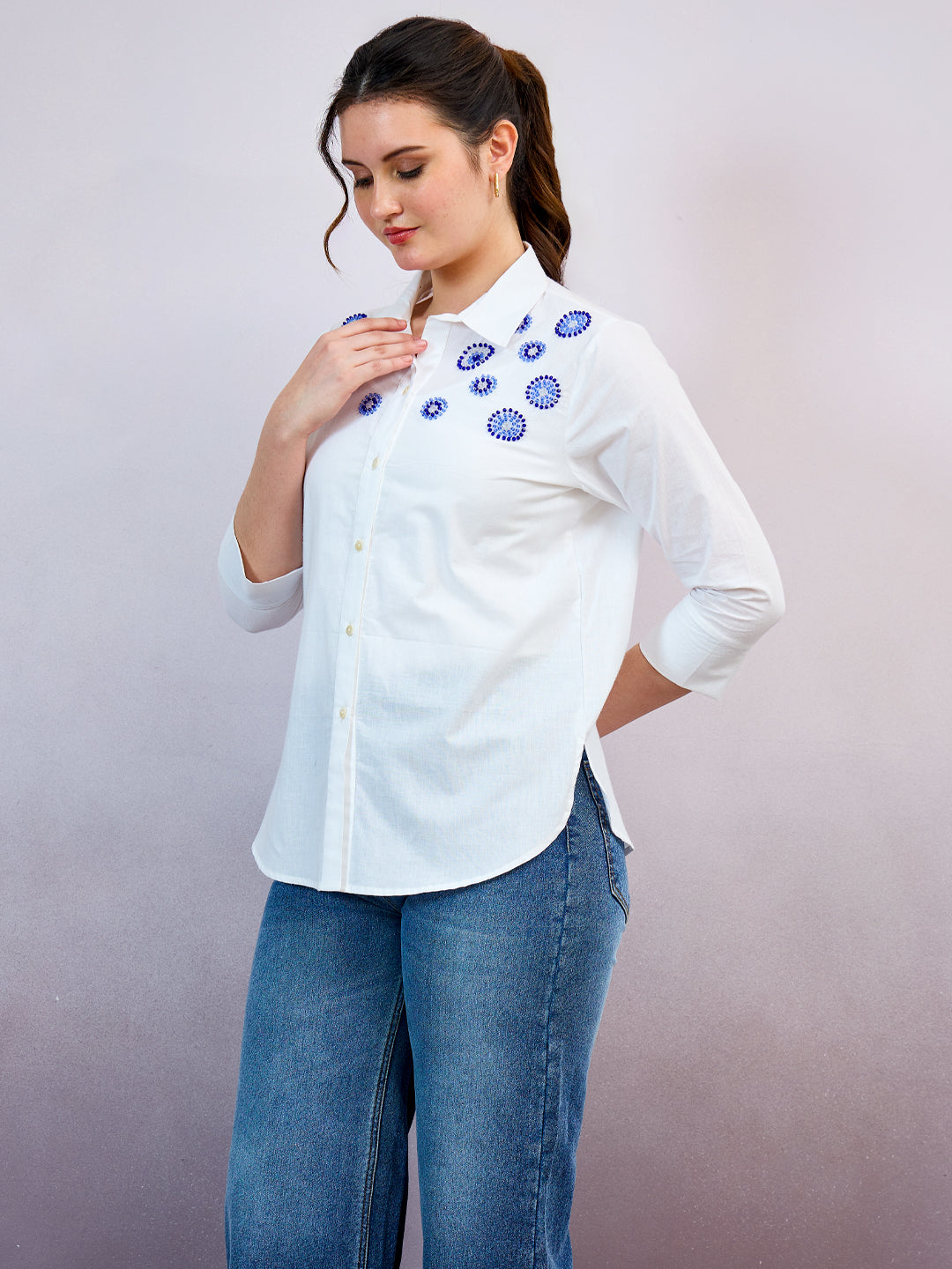 White and blue solid opaque casual shirt ,has a spread collar, button placket, three-quarter regular sleeves, curved hem