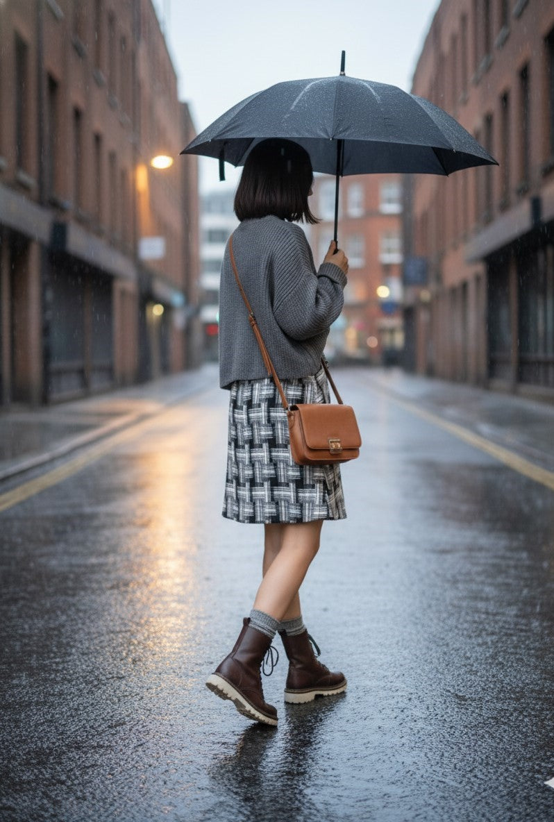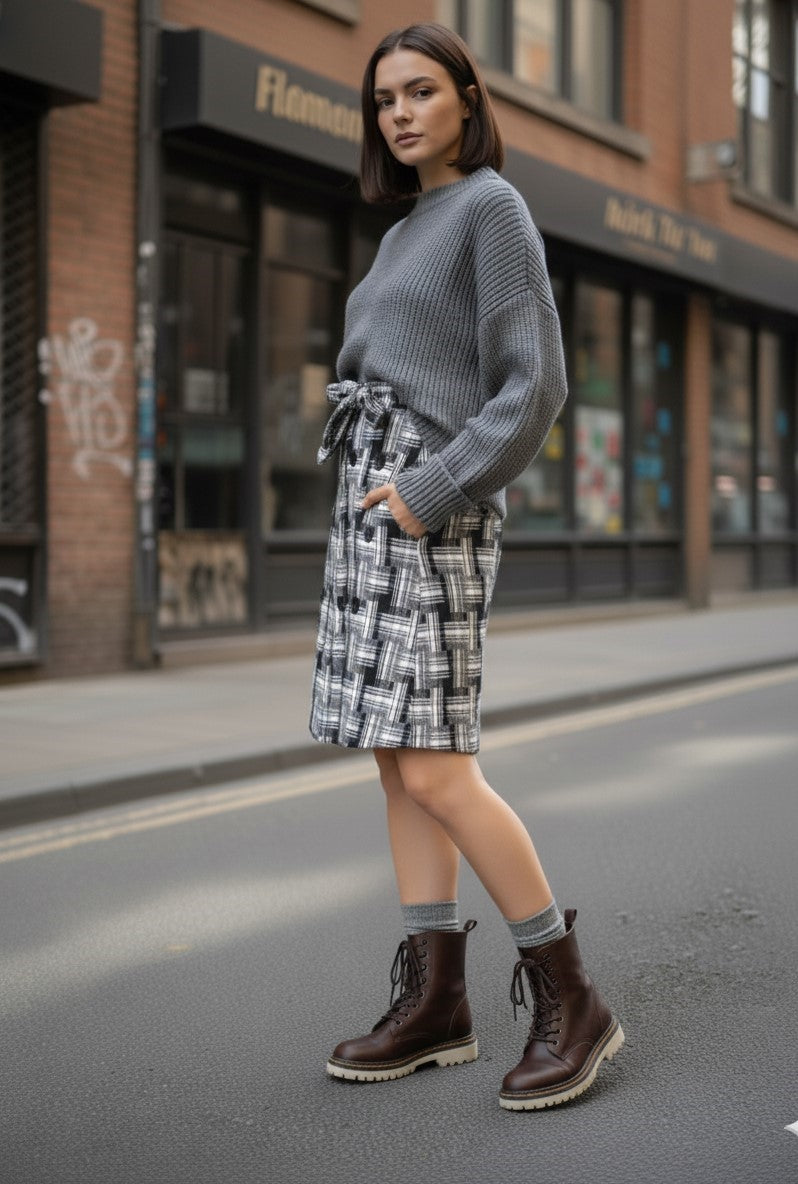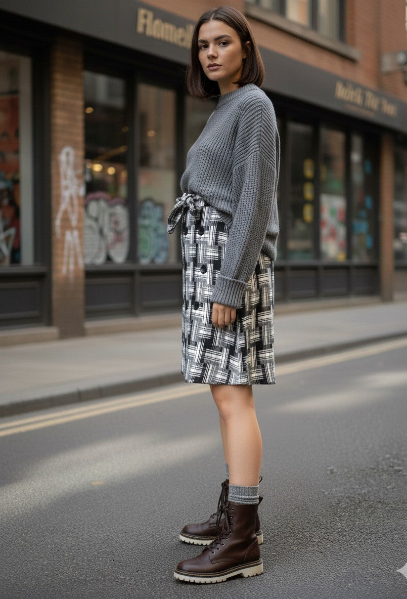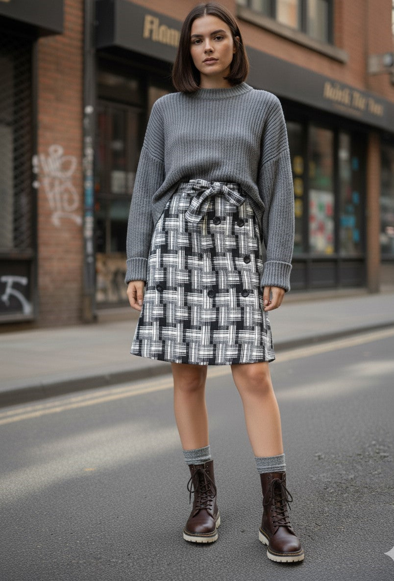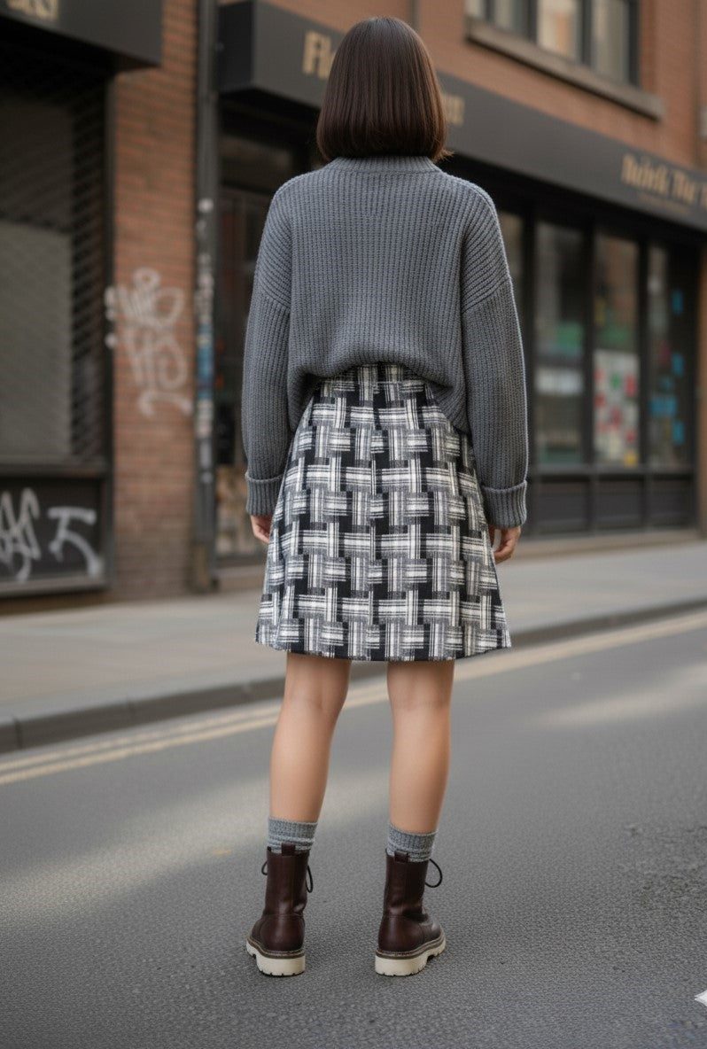 Black and White checked A-Line knee-length skirt, has an elasticated waistband with slip-on closure, and a flared hem