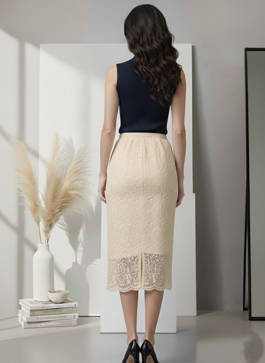 Beige self design Straight midi skirt, has an elasticated waistband with slip-on closure, and a flared hem