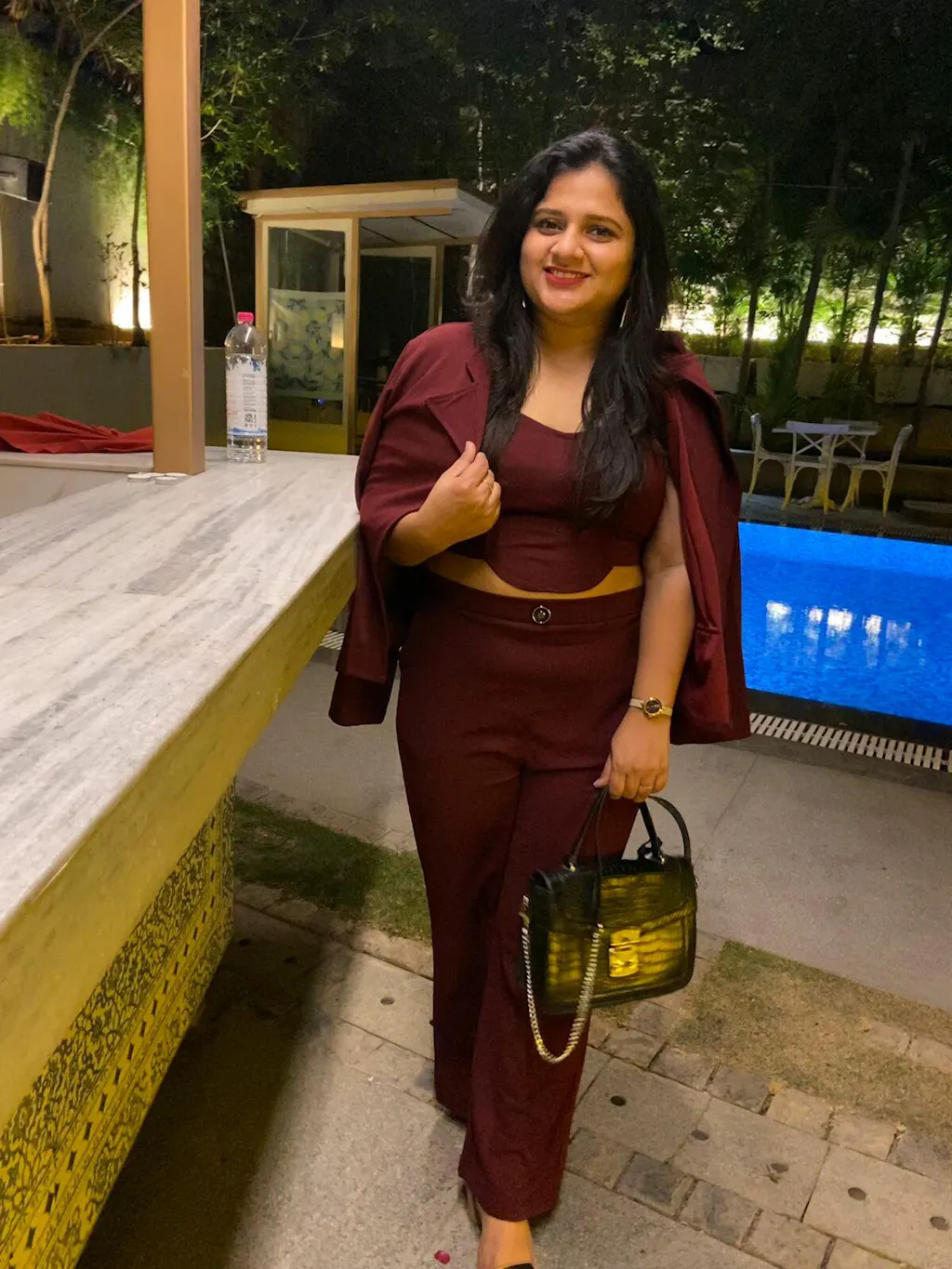 This Co-Ords set consists of a Maroon crop top, has no shoulder straps, sleeveless and sweetheart neck