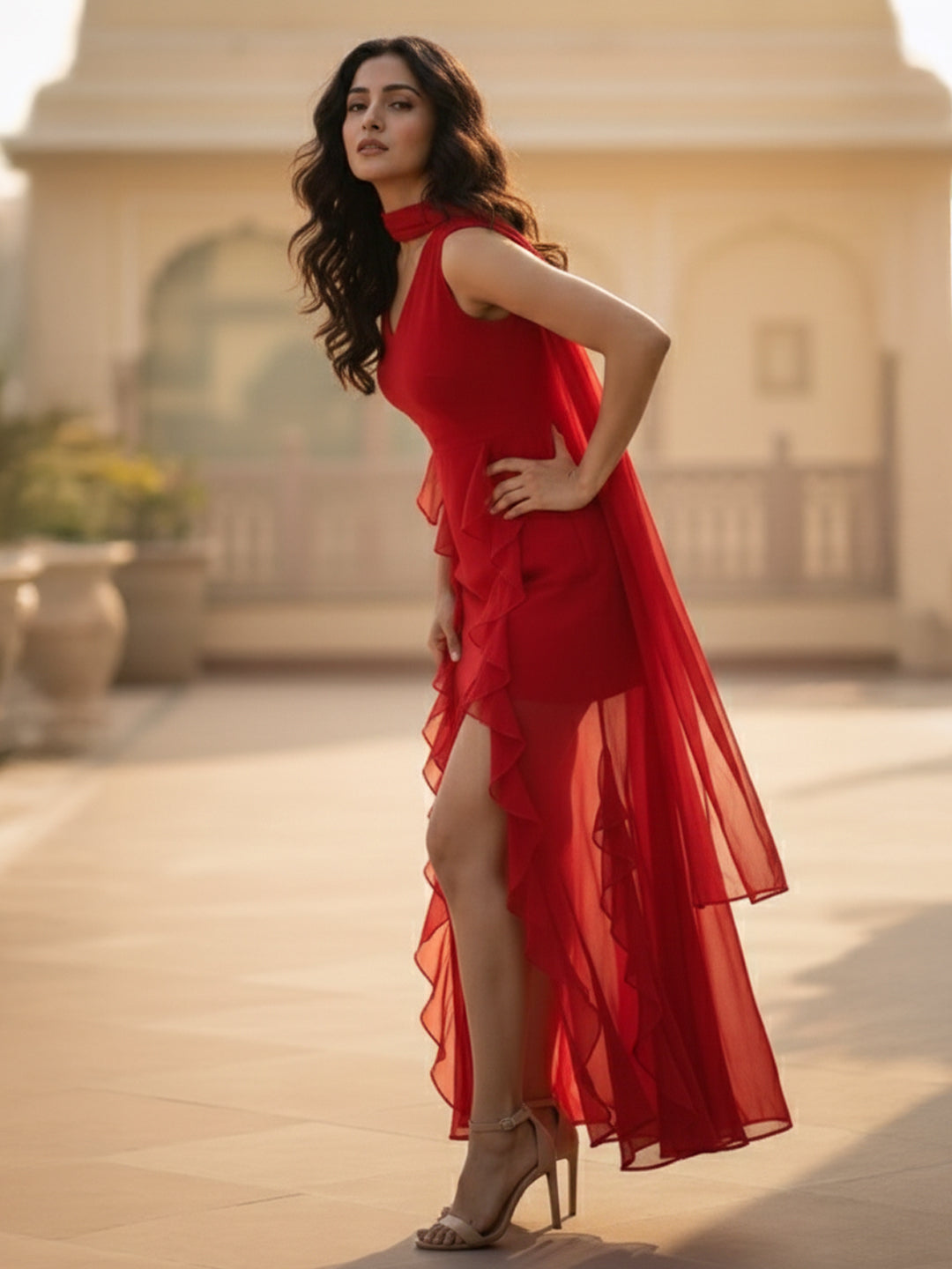 Red Chiffon Ruffles Maxi Dress